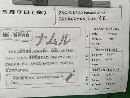 今日は韓国・朝鮮の献立ということで、プルコギ、ナムルが登場しています。「