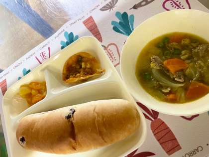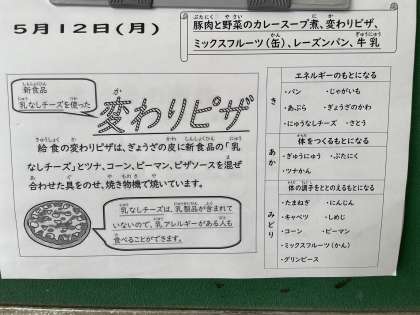 「変わりピザ」は、ぎょうざの皮を使い、ツナやコーン、ピーマン、チーズ(乳なし)などの具材をのせて焼き上げたものが提供されます。
