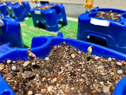 「先生、あさがおの芽が出てきたよ!見て!」と教えてくれた子どもたち。