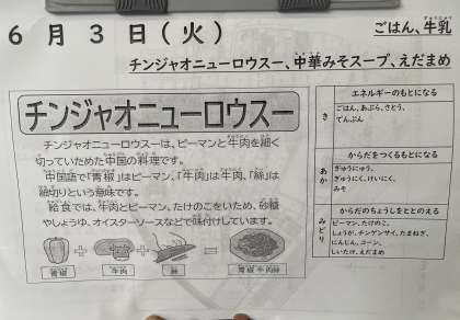 「チンジャオニューロウスー」の「チンジャオ」はピーマン、「ニューロウ」は牛肉、「スー」は細切りという意味です。「
