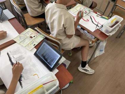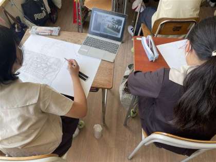 学校の中で自分のお気に入りの場所を見つけ、絵に描いています。