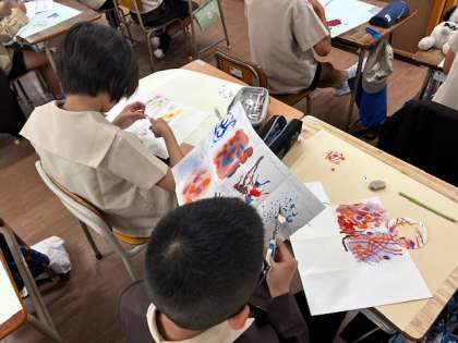 今週は、様々な技法で作ったパーツを好きな形に切り、画用紙に貼り付けました。