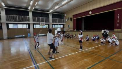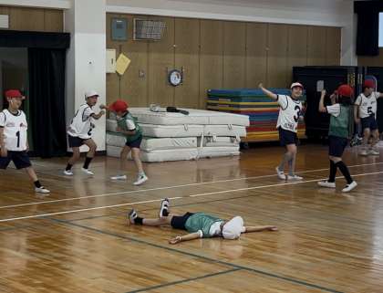 4年の体育では表現運動に取り組んでいます。これはケンカではありません。これはエアボクシングです。だれか倒れているよ。とてもいい表現ですね。二つ目の写真は大きなボールがとんできたぞ!エアキャッチボールです。みんなとても楽しそうに取り組んでいました。
