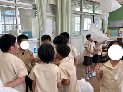 袋に空気を溜めて、みんなでふわふわの心地を楽しみました。