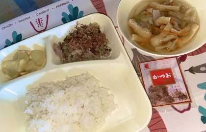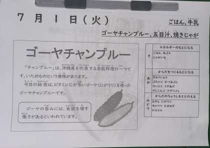 今日は夏野菜の「ゴーヤ」を使った「チャンプルー」が献立に登場です。「チャンプルー」は沖縄県を代表する家庭料理の一つで、“炒め物”という意味があります。