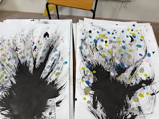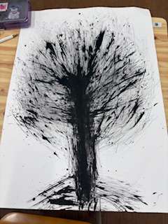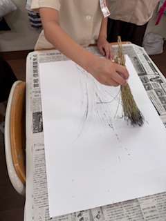 わらペンを使って 、墨汁で森の木を描きました。周りに小さな花を沢山咲かせ、小人たちや動物が楽しそうに遊んでいます。素敵な作品となりました。