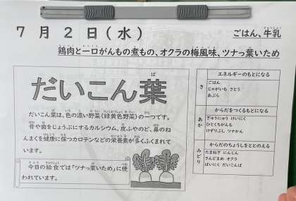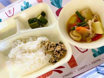 ごはんにかけていただく「ツナっ葉いため」は、子どもたちに大人気のメニューです。大根葉とツナを味付けして混ぜ合わせたものを、ご飯の上にかけていただきます。