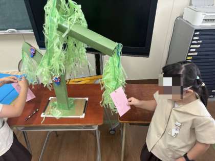 今日のこばとタイムでは、一学期の締めくくりにどんな活動をしたいかをみんなで話し合いました。その後は、図工の学習で作っていた笹に、願い事を書いた短冊をみんなで仲よく飾りました。