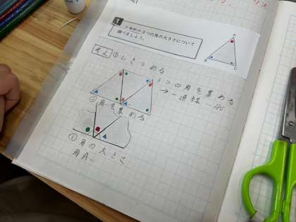 紙の三角形を切って角を集めて並べる活動を通して、どんな三角形でも角の和が180度になることを発見することができました。
