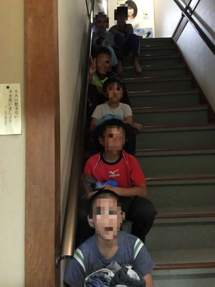 時間を守って、きちんと階段で待っています。5分前行動、素晴らしいですね。