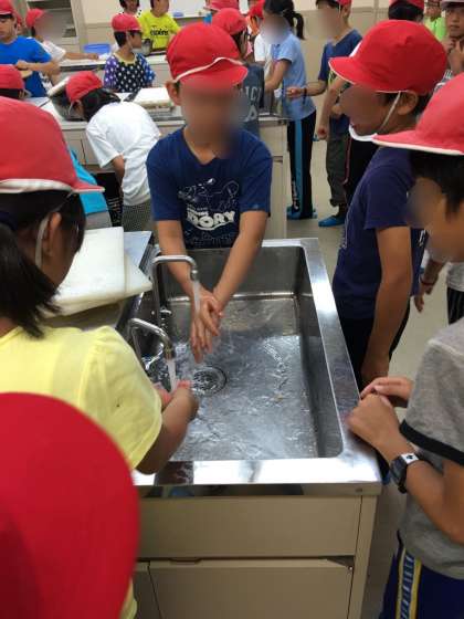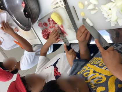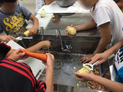 屋内の、調理実習室を借りて野菜を洗ったり切ったり、、、