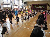 5、6年生が1年生と一緒に手をつないで入場し、2〜6年生は歌に合わせてダンスで迎えました。