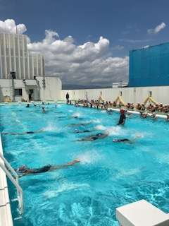 学校では、プール開放が行われています。高学年が低学年とペアを組んで、仲良く練習しています。