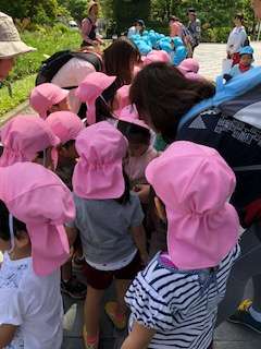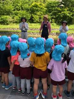 里山にはたくさんの木々やお花があり、子どもたちは木々の話を聞いたり、触ったりして楽しみました。また、カエルや大きなミミズを見て、「ギャー」と驚いている姿もとてもかわいらしかったです。里山では、いもの苗をもらって植えました。最後に「大きくなぁーれ」の魔法の言葉をかけて・・おいもができるのを楽しみにしていました。