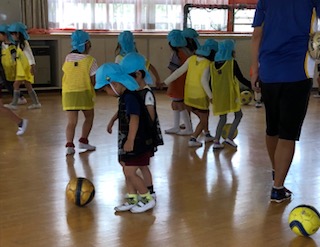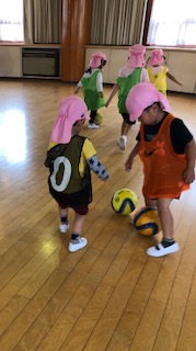 きりん組は去年からの経験で、ユニフォームを着て友達とペアになりサッカーボールを蹴ったり、パスをしたりして楽しんでいました。先生の話をよく聞きながら、さっと行動ができる、さすが年長組でした。