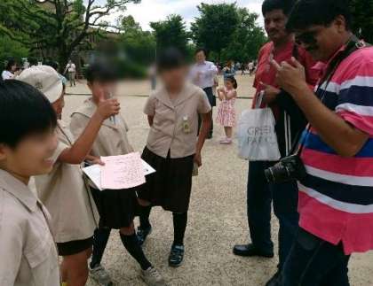 お弁当を食べ終わった後は、大阪城に来ていた外国の人たちと交流しました。自己紹介をし、出身地や好きな日本食などを英語でインタビューしました。子ども達は班の友達と協力して意欲的に活動し、外国の人たちは始終笑顔で接して下さり、とても心温まる楽しい交流会になりました!