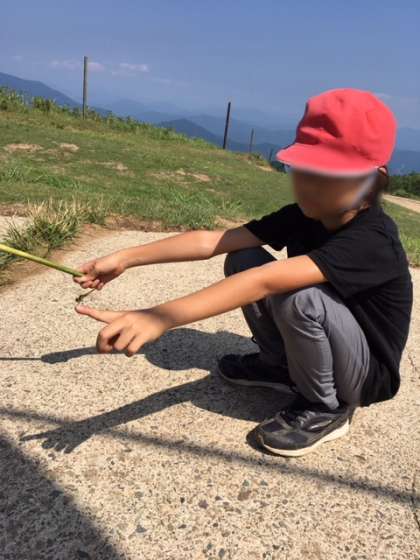 頂上でみんなを待っている間に、とんぼが手に止まりました!