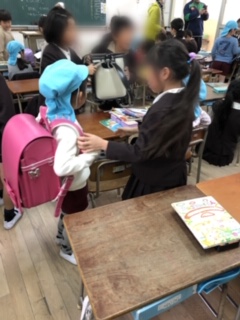 その後、きりん組は2年生の教室でランドセルを背負わせてもらったり、教科書を見せてもらったりしました。一年生への期待が高まった時間でした。