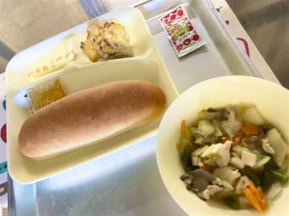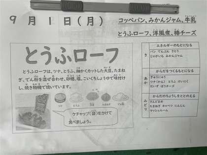 「豆腐ローフ」の「ローフ」とは、調理された大きなひとかたまりの食品を指し、「ミートローフ」のように、ひき肉と野菜などを混ぜて型に詰めてオーブンで焼いた料理などが有名です。給食では、豆腐とツナ、玉ねぎなどを混ぜ合わせて焼き上げたものに、ケチャップが添えられて提供されます。