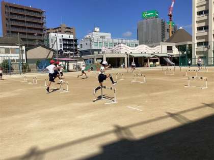 運動場の体育の学習では、ハードル走を行っています。まずは、40mのハードルなしのタイムを計りました。走る・跳ぶ・リズムを合わせるといった複数の動きを組み合わせながら、楽しみながら挑戦しています。
