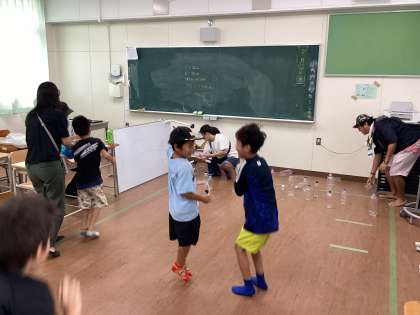 オリエンテーション活動の様子です。子どもたちはグループごとに、ペットボトルフリップ、パットゴルフ、ピラミッド崩し、1円玉落とし、ペットボトルボーリングなど、さまざまなゲームに挑戦しました。