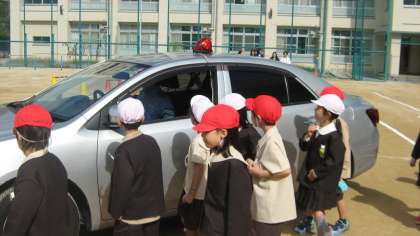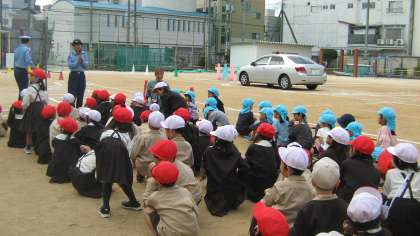 大淀署の方に来ていただき、道路の正しい歩き方について、1年生と中大淀幼稚園の園児がお話を聞きました。