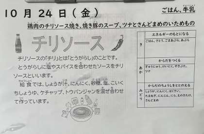 チリソースの「チリ」とは「唐辛子」のことで、そこに塩やスパイスを合わせたものをチリソースといいます。給食では、しょうが汁、にんにく、砂糖、塩、濃口しょうゆ、ケチャップ、トウバンジャンを混ぜ合わせてチリソースを作っています。