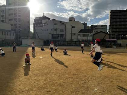 運動場の体育の時間に縄跳びに取り組んでいます。