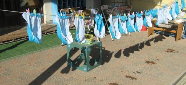 先日、1年生は自分たちの靴を洗いました。この経験を生かして、今日は中大淀幼稚園の子どもたちの帽子をいっしょにきれいに洗いました。
