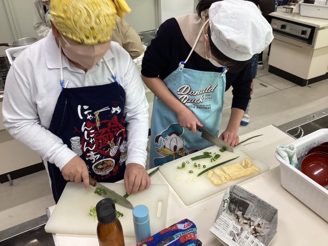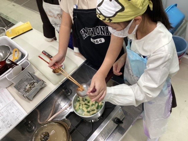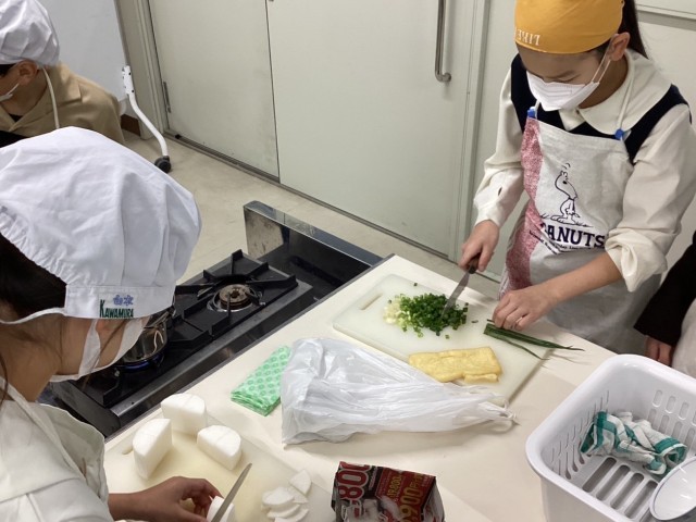 味噌汁作りでは、いりこから出汁をとりました。具材の大根や油あげ、ネギも班で協力して準備し、調理を進めました。