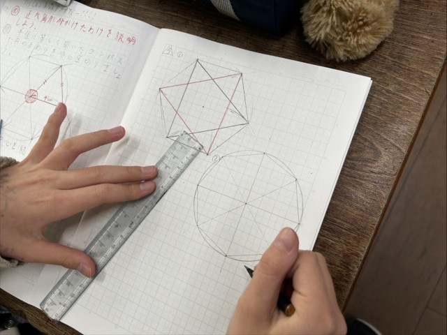 どの図形が隠れているのか、どこから線を引けばよいかを考えて、コンパスや分度器を正しく使って作図しました。