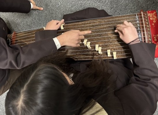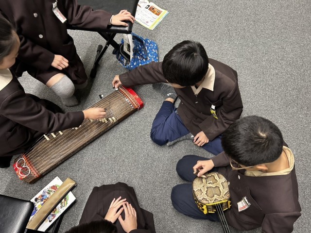音楽科で、弦楽器である琴と三線を手に取り、音を出す体験をしました。