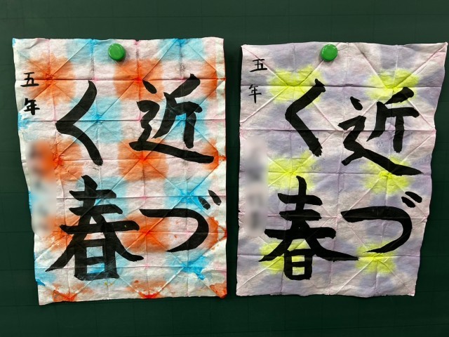 書写で「近づく春」を書いた半紙を使って、折りぞめを行いました。