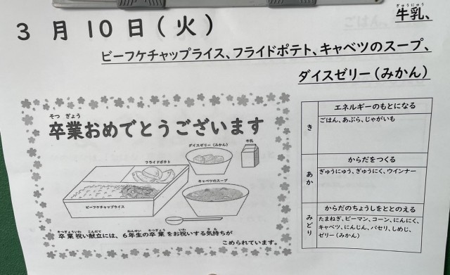 今日は「卒業祝い献立」ということで、いつもの給食より1品多い献立になっています。