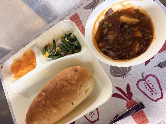 今日の献立は、○ビーフシチュー○ベーコンとさんどまめのソテー○みかん缶○おさ...