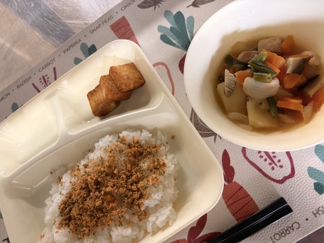 今日の献立は、〇豚肉とじゃがいもの煮もの〇あつあげのしょうゆだけかけ〇紅ざけ...