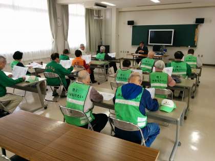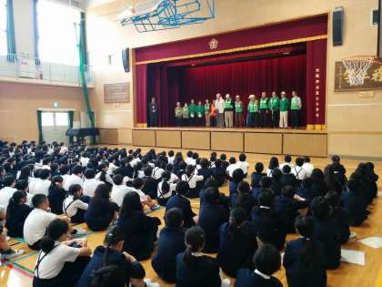 今朝の児童朝会には豊仁地域みまもり隊の皆様にお越しいただきました。