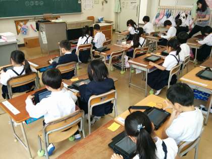 1年生が1組・2組・3組の順にタブレットの使用方法を学びました。タブレットを操作する子どもたちからは歓声が何度もあがり、楽しく学習することができました。