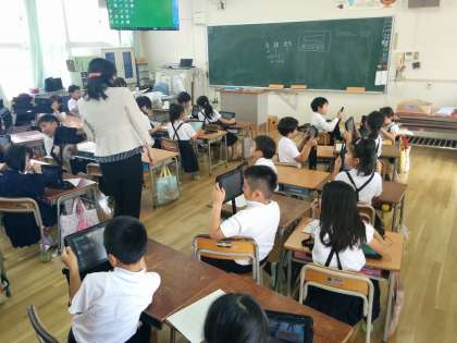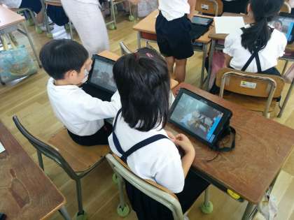 3枚目の写真のように、タブレットはすべてネットワーク接続されているので、子どもたちみんなが撮った写真を一覧で表示したり、特定の写真を並べて表示して比較したりと、視覚的にもわかりやすい効果的な学習を進めることができます。