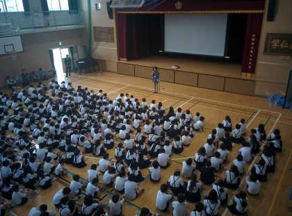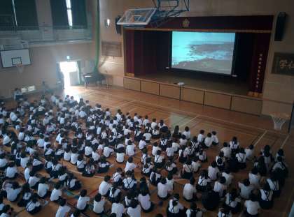 引き渡し訓練、休憩の後、講堂で地震・津波の講話とビデオ視聴による学習を行いました。