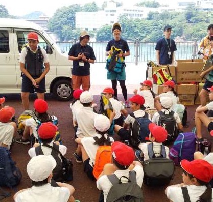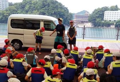 船に乗る前にライフジャケットを着ます。