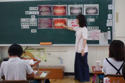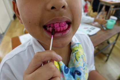 歯科衛生士さんに来ていただき、歯と口の健康教室をしました。健康を保つためには歯の健康は欠かせません。歯科衛生士さんから口の中の菌について学習しました。その中で、歯垢がわかる薬をつけ、菌が付着していることを実感しました。食事ごとに歯磨きすることは大切です。いつまでも健康な歯を保つ努力をしましょう。