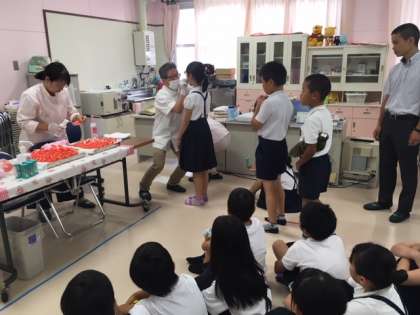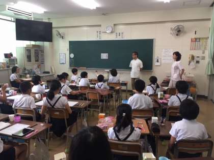 学校医の歯科医先生と歯科衛生士さんに来ていただき、教室で正しい歯磨きの仕方を教わった後、フッ化物塗布をしました。