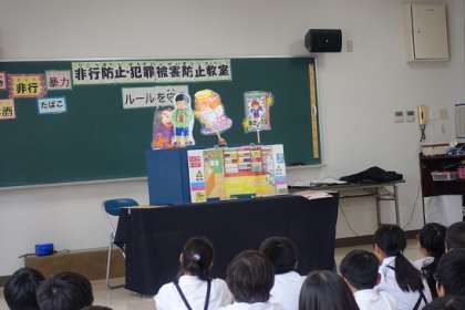 「ルールを守る」ことの大切さを万引きの人形劇でわかりやすく話をしていただき、子どもたちはよく理解できたと思います。また、その後、悪いことに巻き込まれないように代表の児童とサポートセンターの方が寸劇をしました。
