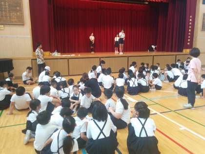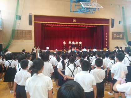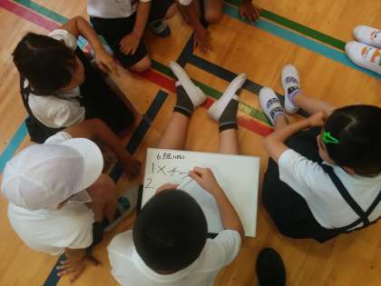 今朝は児童集会が行われました。5・6年生の集会委員が司会進行をして、「○×クイズ」をしました。縦割り班ごとに相談して○か×かを考えました。