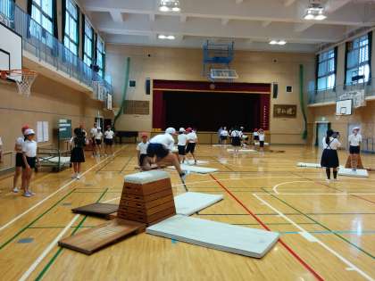 今日の5時間目の6年生の授業の様子です。上の写真は英語(キーワードゲーム)、下の写真は体育科(跳び箱運動)です。しっかりとめあてをもって取り組むことができていました。