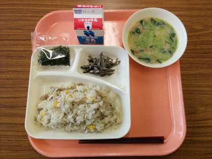 今日の給食は、お正月献立(れんこんのちらしずし、ぞう煮、ごまめ、牛乳)でした。とてもおいしかったです。