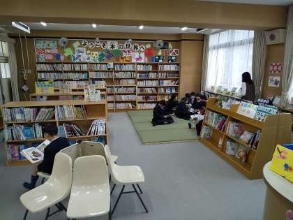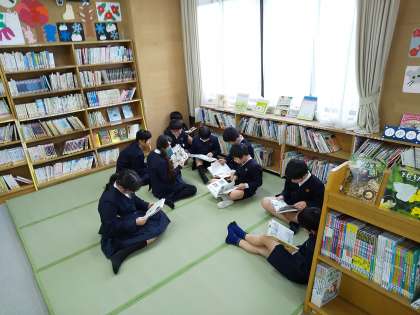 冬休みに図書室を改装し、写真のように畳スペースを設けました。休み時間の図書室開放には高学年の児童もやってきて、読書をしています。