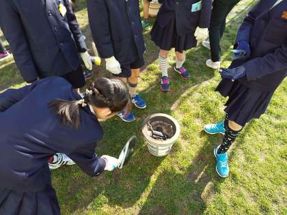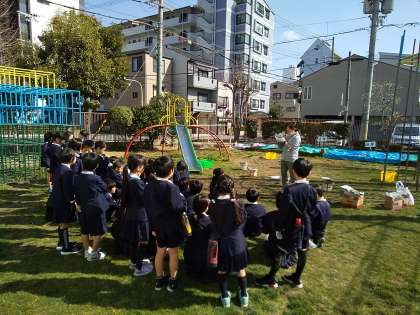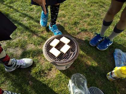 3年生が社会科の学習で、七輪体験をしました。炭火でお餅を焼いて食べました。