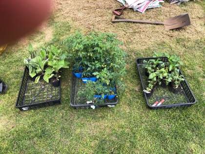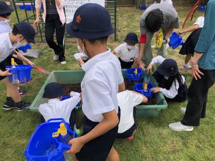 管理作業員さんに作ってもらった土を鉢に入れ野菜の苗を植えました。